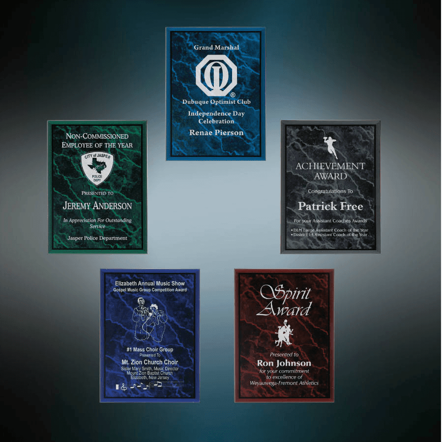 Elevate your awards and recognition with our Marbleized Acrylic Plaque Plates. These premium 1/8-inch thick plates feature stunning marble finishes in Black, Blue, Green, Purple, and Red—perfect for customization through laser or rotary engraving. Each plate comes with bright white double-faced adhesive for seamless mounting to any plaque. Ideal for corporate recognition, sports achievements, and special milestones. Delivery in 1-2 weeks.
