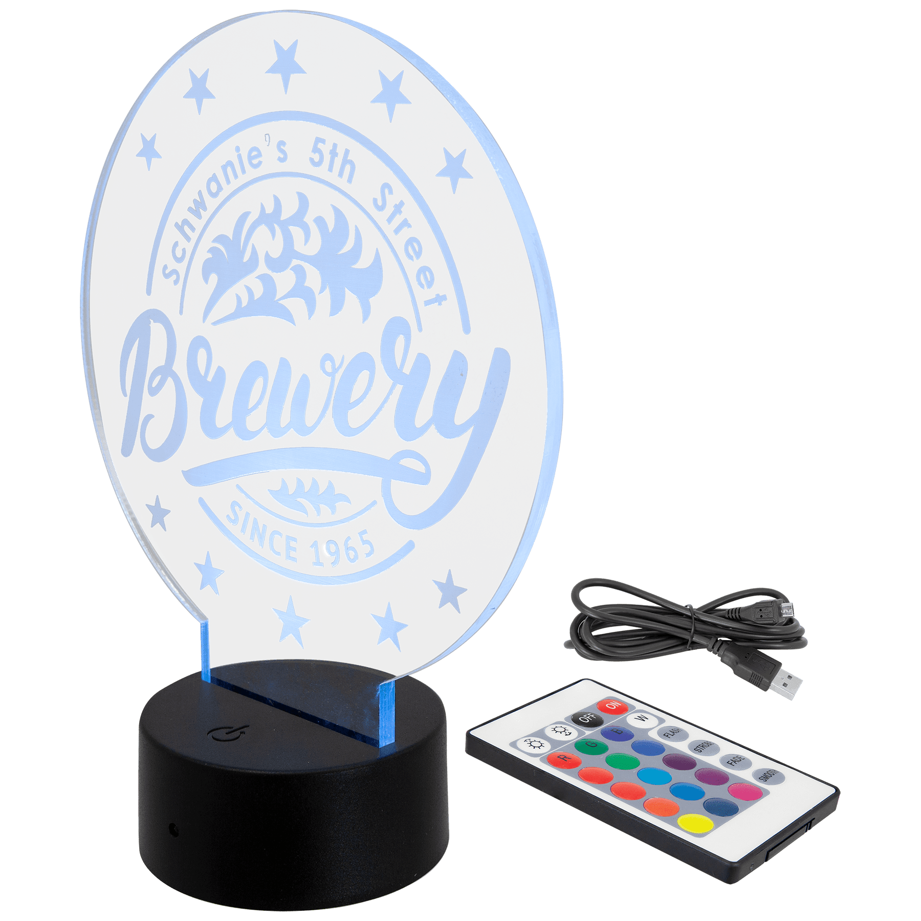 Elevate your recognition with custom 1/4" acrylic awards featuring a dynamic LED lighted base. Choose from round or rectangle designs, each measuring 8"x8", perfect for corporate awards, trophies, or business signage. The included remote-controlled base offers 16 color options with adjustable brightness, flash, strobe, and fade effects to showcase your custom artwork. Each piece is made to order with 1-2 week delivery. Transform your acrylic designs into stunning illuminated displays that command attention.