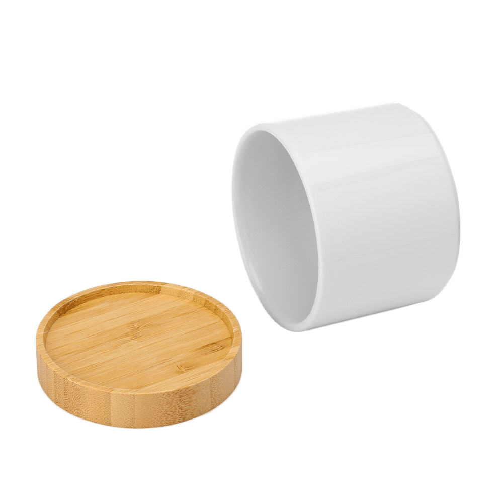 Elevate any space with this Ceramic Sublimation Planter featuring a customizable bamboo tray base. The ceramic housing accepts sublimation, heat transfer, and vinyl personalization, while the bamboo base offers engravable surfaces for laser or UV-LED printing. Standing 3.54" tall with a 4" diameter (4.13" with base), this versatile planter includes drainage functionality to support healthy plant growth. Perfect for real or artificial plants, it's an ideal gift or personal accent piece that combines practicality with endless creative possibilities.