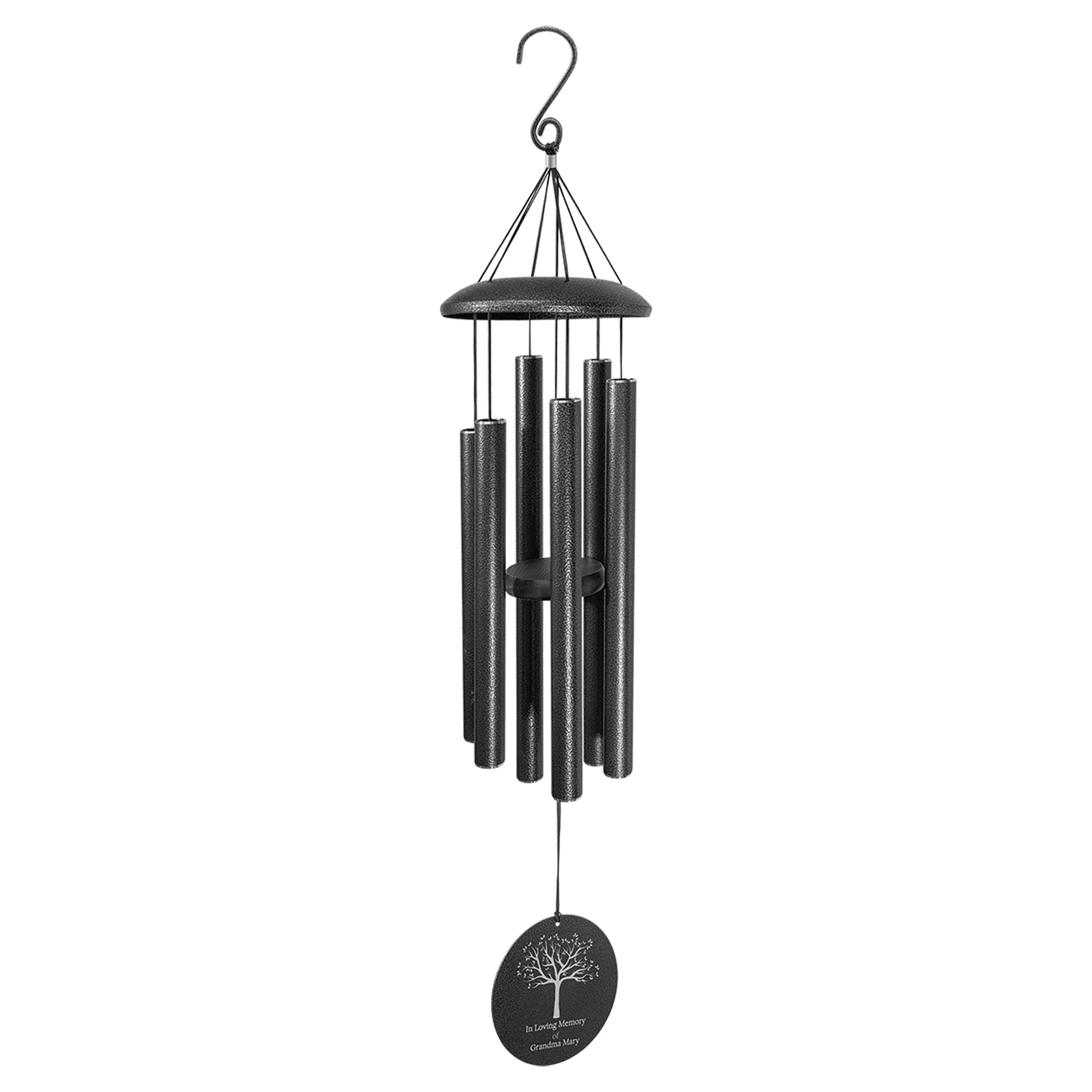 Elevate any space with this striking 36" black powder coated aluminum wind chime. The 5 1/4" disc is fully customizable via laser engraving or UV printing on both sides, making it perfect for personalized gifts. Six tuned aluminum tubes, ranging from 11 1/4" to 16" in length, create a rich, melodic tone with even the gentlest breeze. Ideal for housewarming celebrations, memorials, or adding a touch of elegance to patios, gardens, and outdoor living areas.